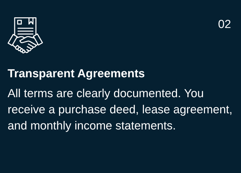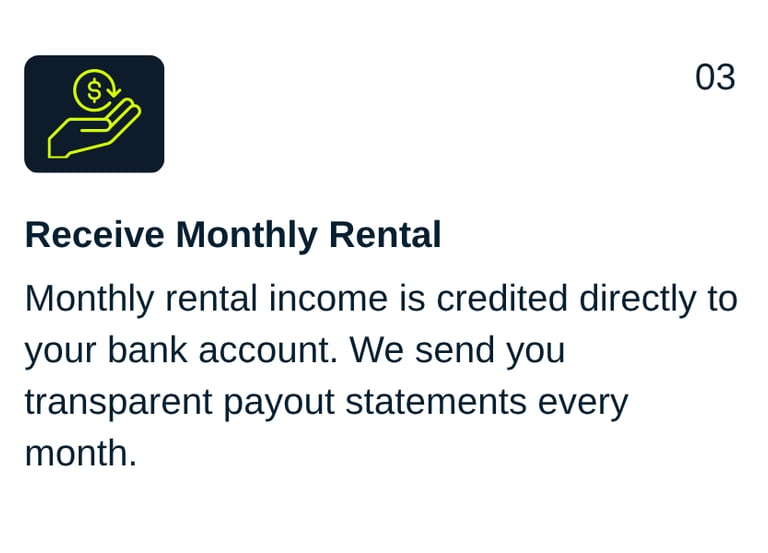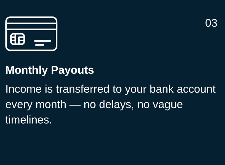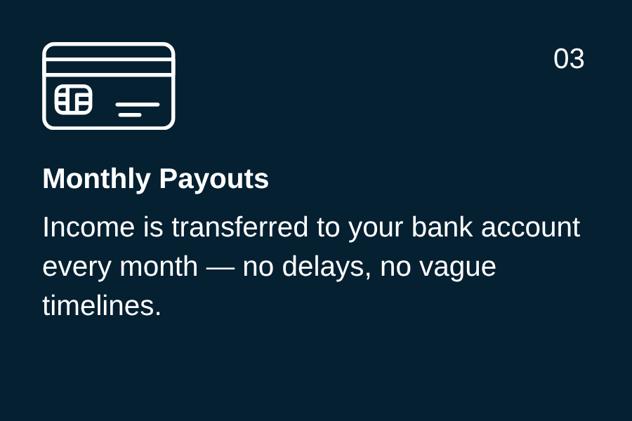 A straightforward, 3-step process from purchase to regular monthly income — fully managed by our team.